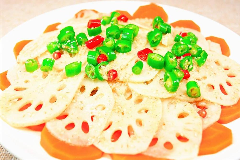 3.把胡萝卜焯一下水,把莲藕也焯一下水:藕片煮40秒钟即可,煮太久的话脆嫩度不够,煮好以后要快速放入凉开水中过一下凉,便于保持清脆。