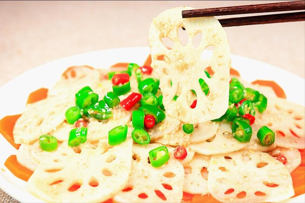 藕片晾干水分以后放在盆中,倒入刚刚调好的料汁,搅拌均匀后腌制10分钟,让藕片充分吸收料汁入味。