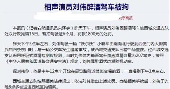 一时间,刘伟从一个名气相当当的相声演员因为醉酒驾驶沦为“阶下囚”。