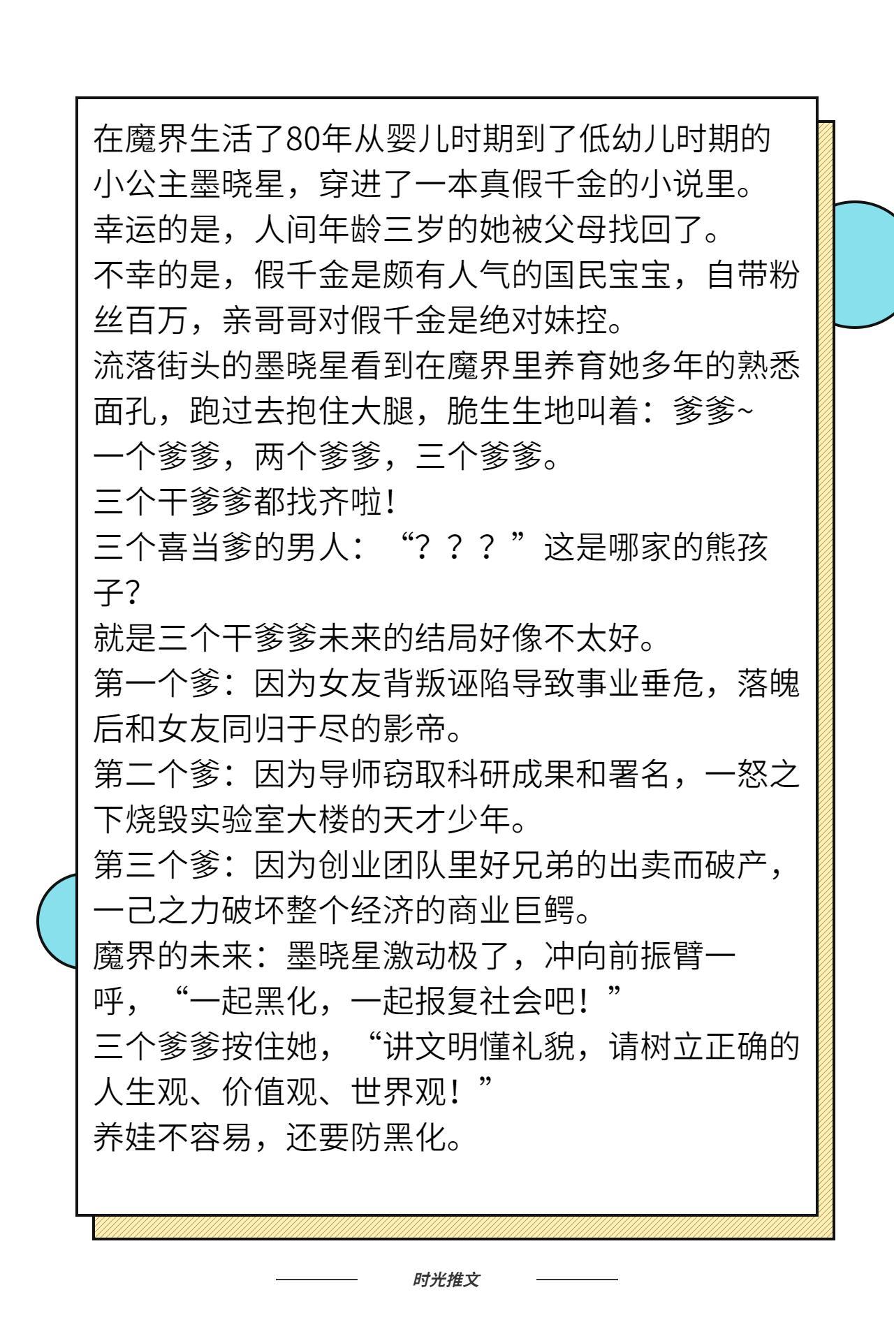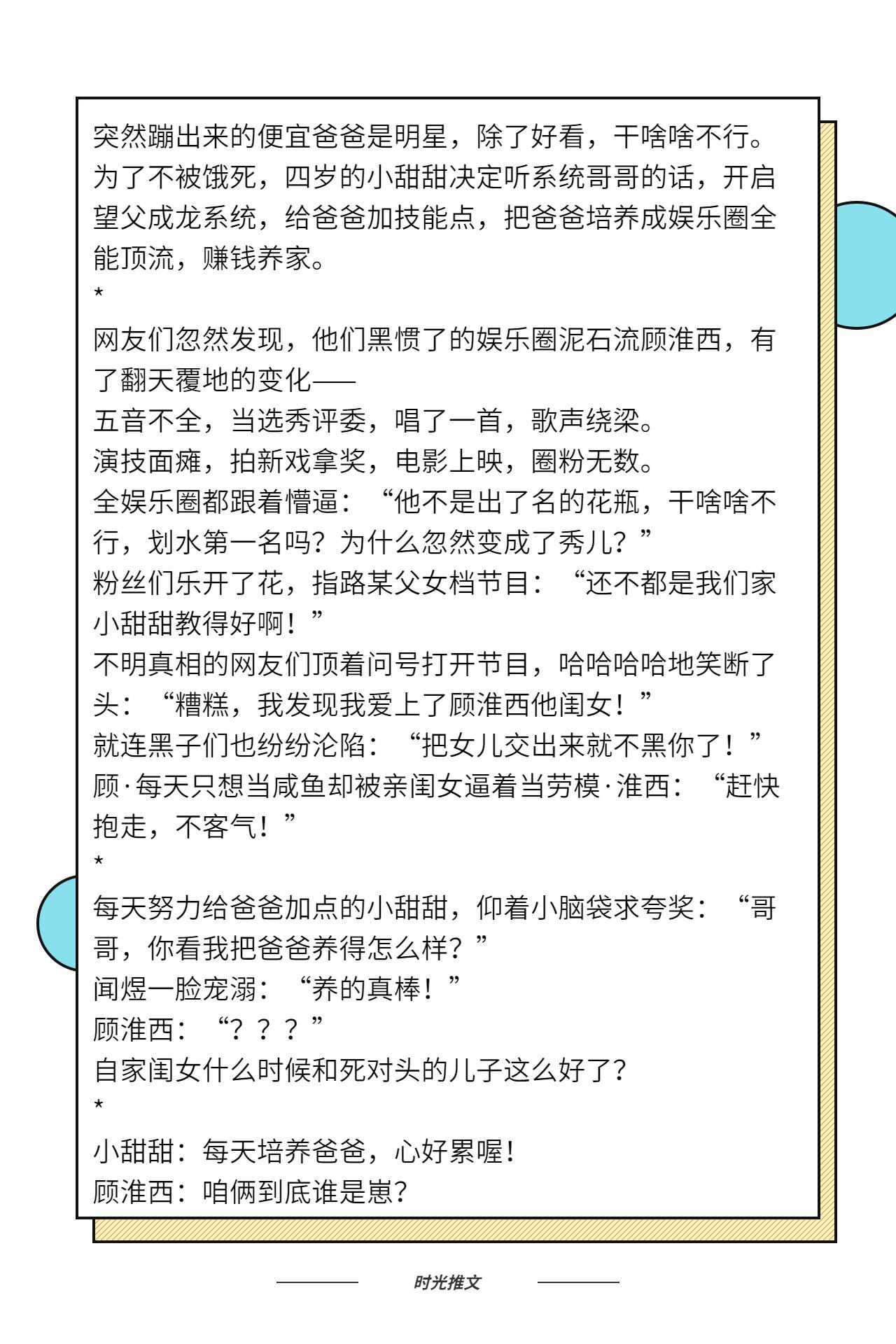 第五本:女主她才四岁,亲妈意外去世,女主绑定了一个系统,系统带她找到了她毫不知情的顶流爸爸,看着顶流爸爸唱歌不行,演技不行,脾气还不好,小女主决定听从系统的忽悠开始养爸爸,她要努力做任务,给爸爸加技能点~