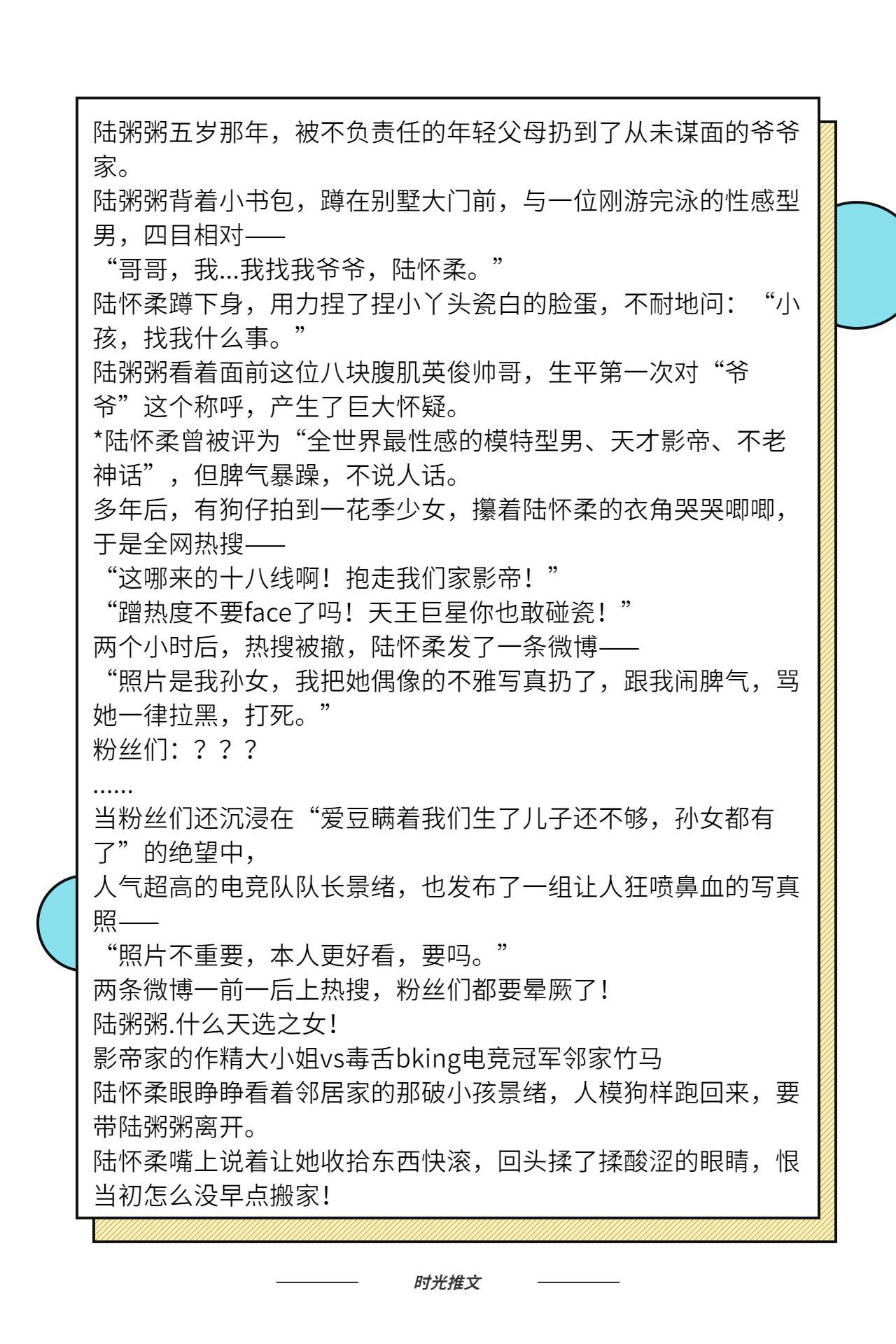 第六本:小女主是五岁,亲爹亲妈不靠谱,一个是网红带货没时间,一个整天打游戏,于是小女主就被亲爹送到亲爷爷那里,谁知亲爷爷他是顶流,据说脾气不好,还会打人的顶流,小女主瑟瑟发抖~