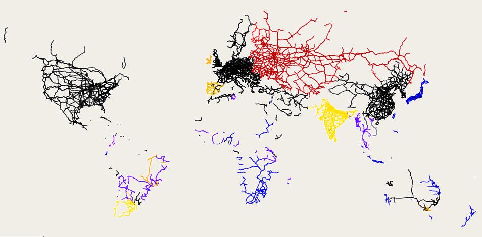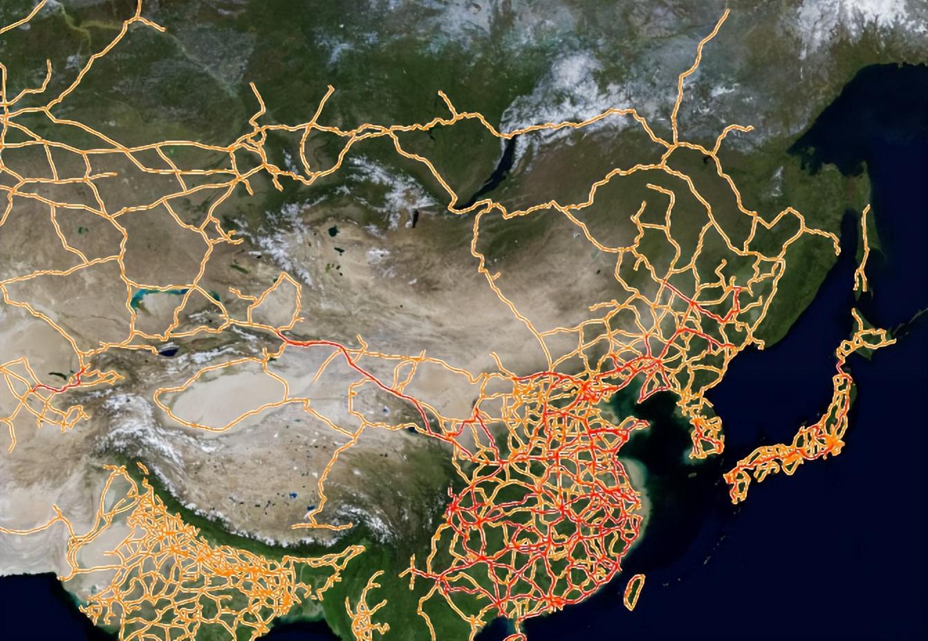 红色线路是高铁,地图上看,主要集中在中国、欧洲、日本。印度虽然铁路里程、密度高,但基本没有高铁线路。