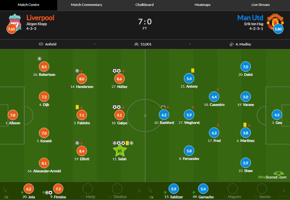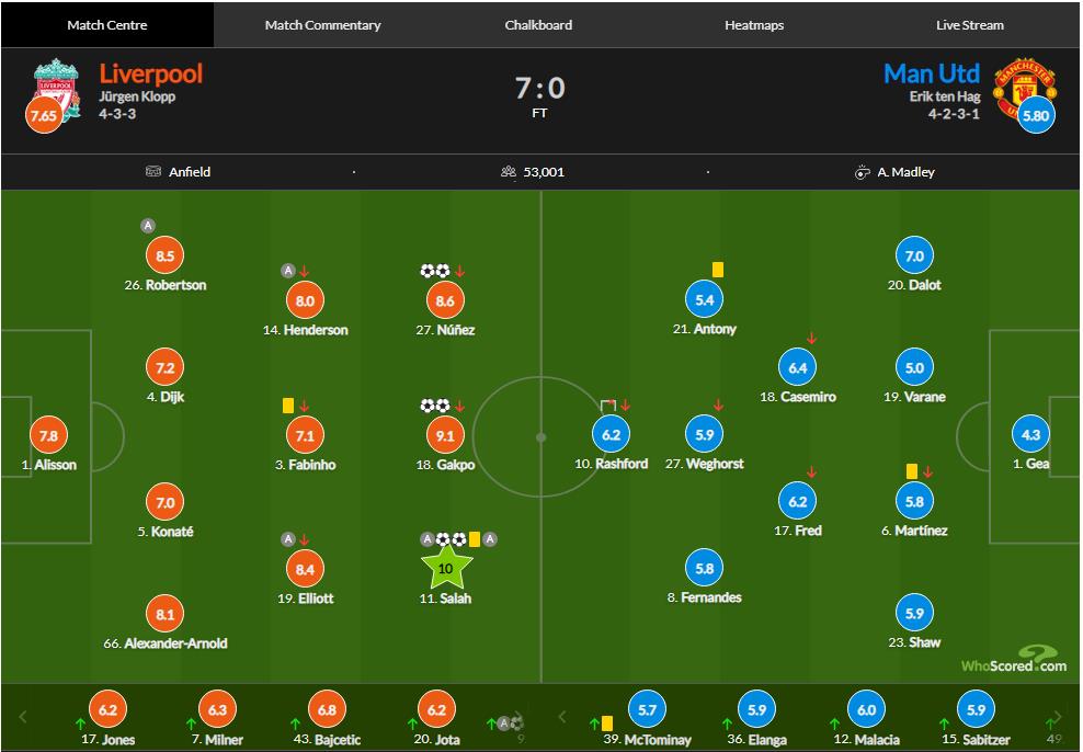 第66分钟,利物浦打出快速反击,亨德森在后场传球,努涅斯带球来到前场直塞被断,随后他再垫传,足球跌跌撞撞到禁区内的萨拉赫脚下,后者转身右脚大力爆杆抽射,利物浦4-0领先曼联。