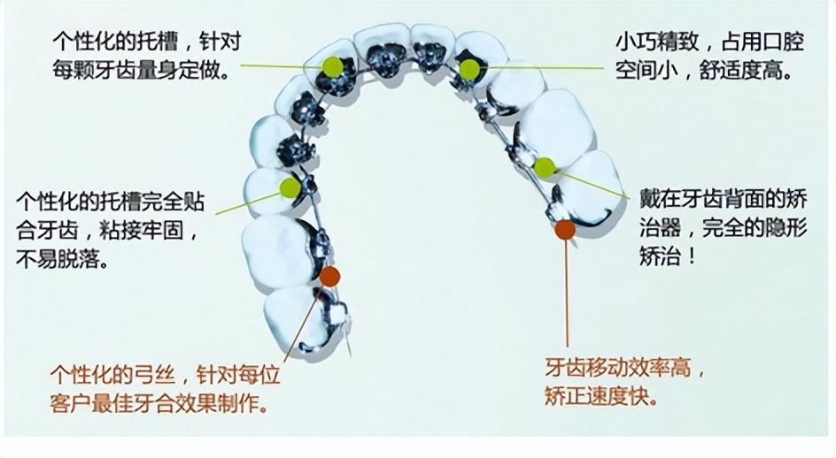 舌侧牙套类似于传统金属牙套,但却安装在牙齿内侧,紧挨着舌头,从牙齿外侧完全看不到牙套,因此也有隐形美观的优点, 而且矫正的速度比隐形牙套快,对于医生的技术要求高。