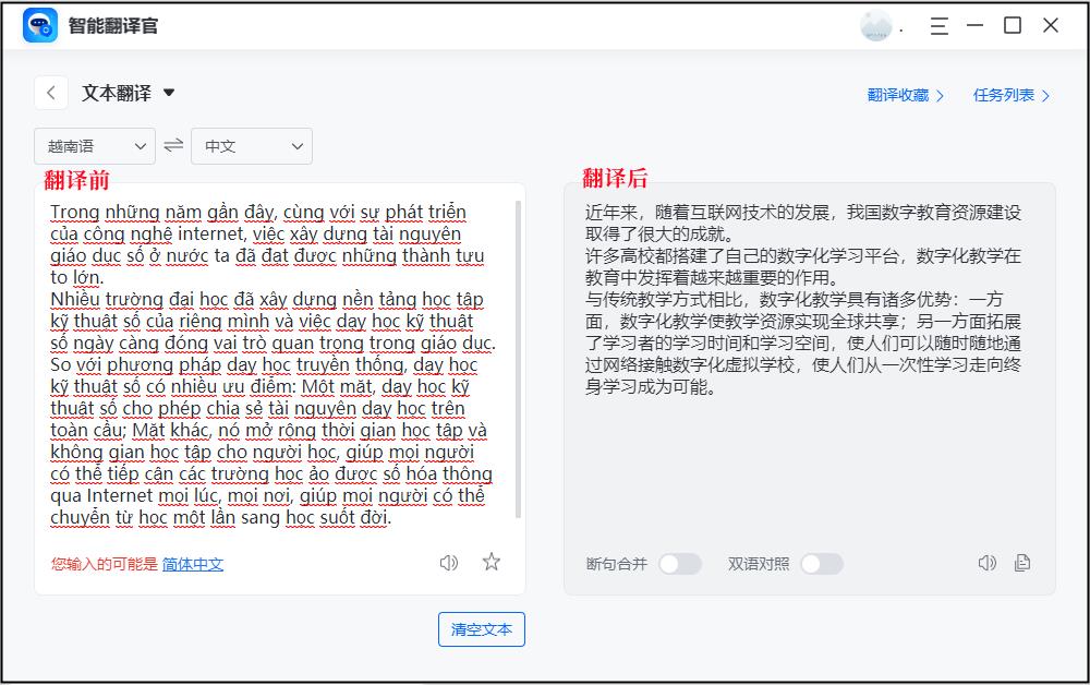 想要把越南语翻译成中文,通过【智能翻译官】中的【文本翻译】功能就能轻松实现,在保证翻译速度快的同时还相当注重翻译的质量。
