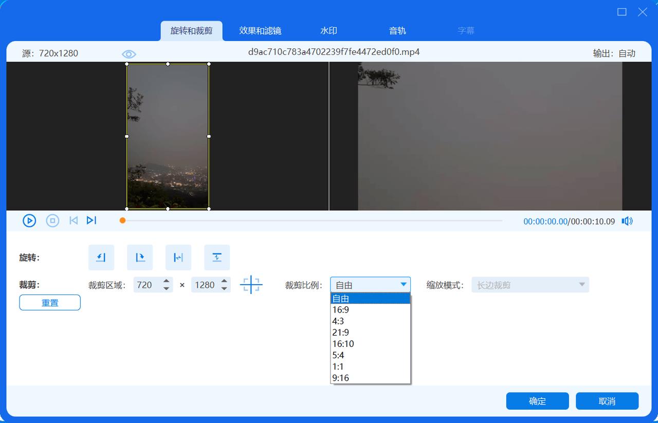 点击“编辑”按钮,我们可进入以下界面,可对单个视频进行旋转、裁剪、添加效果滤镜、添加水印以及增加音乐,设置好后最后点击页面下方的“确定”即可。