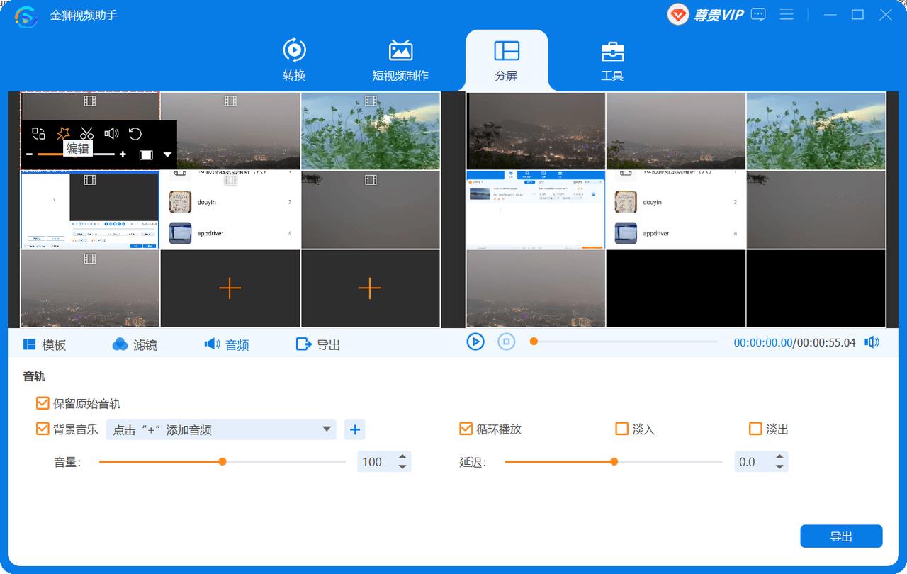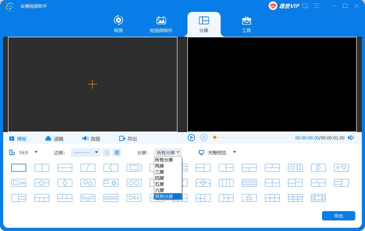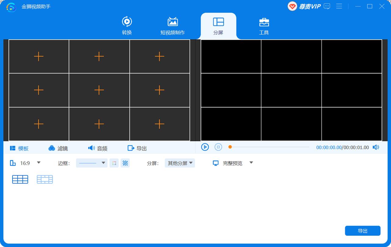 有许多产品和工具可以帮助您制作九宫格视频,但我更喜欢用金狮视频助手。它有一个简单的分屏工具,您可以根据分屏模板快速制作出包含任意数量的分屏视频。当然,也包括九宫格,制作教程如下。