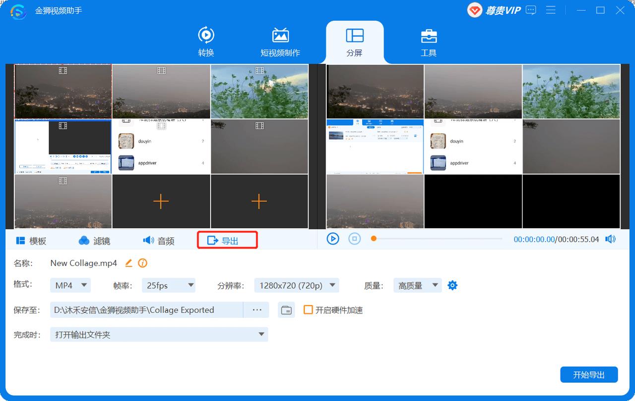 一切都设置好后,我们可将其导出。在导出之前,我们可对输出的格式、分辨率、质量,以及输出位置进行更改。最后,点击右下角的“开始导出”,即可将九宫格视频导出来,然后在保存的位置预览它。
