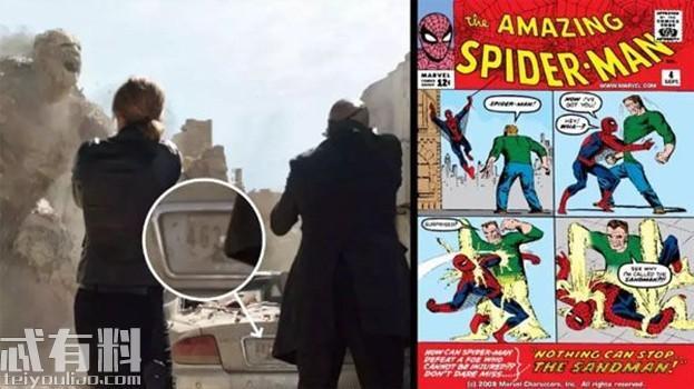 除了这些以外,电影中还有很多细节,做的非常到位。例如元素众出场的时候,影片中的车牌号总是能够对应漫画中它们首次登场的时间,例如沙人登场的时候,镜头前车子的车牌号是463,刚好对应1963年发行的《神奇蜘蛛侠》第4期,也就是沙人(Sandman)首次登场的漫画。