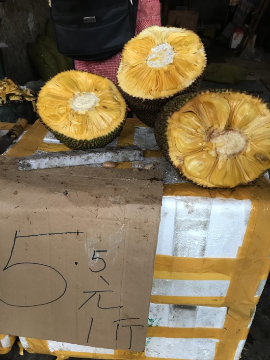 菠萝蜜切块的5.5元一斤,剥好的10元一斤。整个买的3元一斤。这里常年有菠萝蜜卖,老板说一月份到五月份卖越南泰国进口的,六七八月份卖本地湿苞的,九月份以后卖海南的。