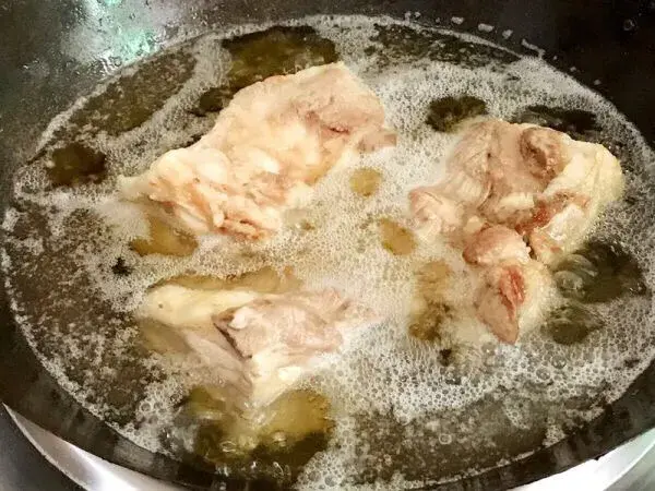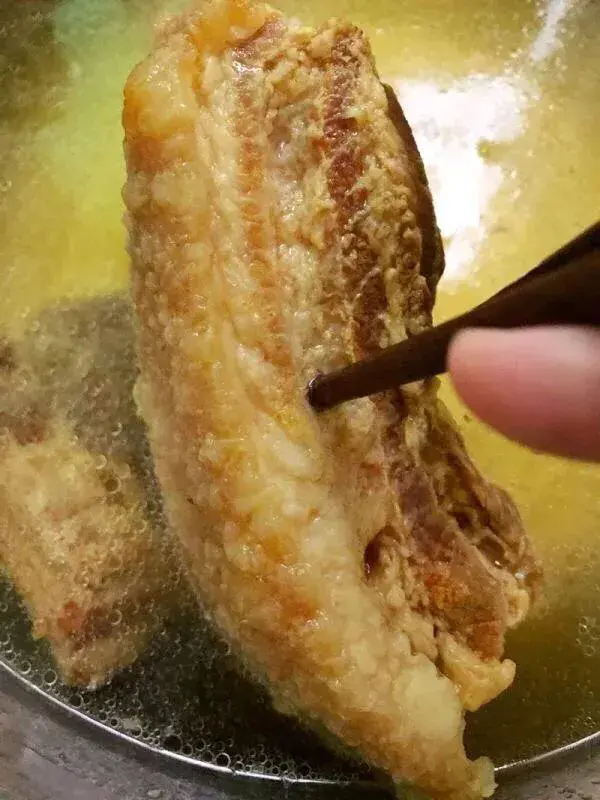 第四步,准备开始炸了!这步重要的在于选油,一定要选纯正的花生油,花生油炸出来的扣肉是最好的!而且最好不要将用过的油反复炸,容易将扣肉炸糊炸焦(用两次还好)在炸的时候如果怕技术不到家,可以在肉底下垫一块篱,不怕焦!