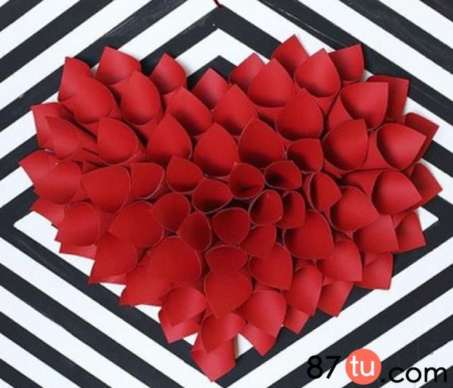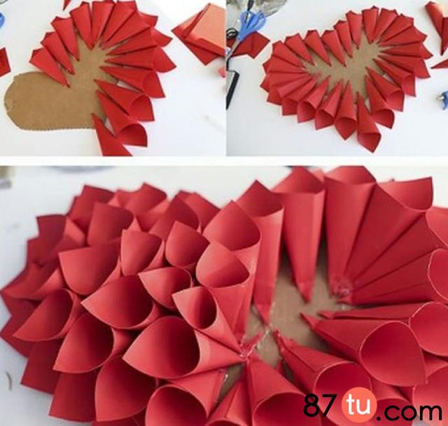 把红纸卷成漏斗状,然后按照上图的样子从边缘开始,黏贴到硬纸板上。将整个硬纸板全部覆盖后,漂亮的爱心装饰就做好啦,是不是超级简单呢,快来试试吧~~~