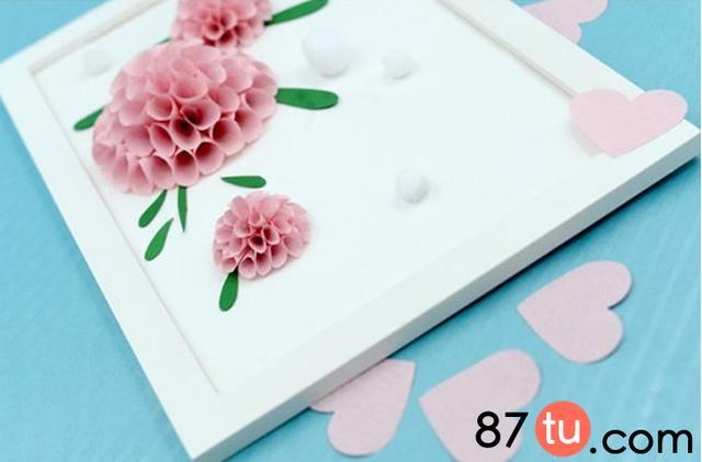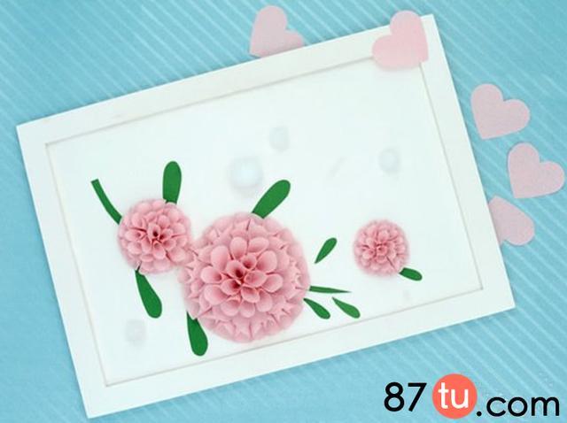 慢慢制作出纸花,最后再把纸花黏贴到画框里,配合上一些绿色剪纸枝叶。