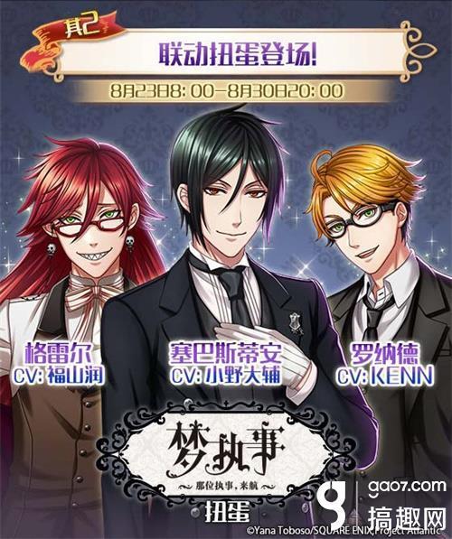 8月23日~8月30日,联动扭蛋也闪亮登场!塞巴斯蒂安(CV:小野大辅)、格雷尔(CV:福山润)、罗纳德(CV:KENN)在扭蛋池中等你o( ̄ˇ ̄)o召唤出少爷的专属执事等角色,开启更多冒险的时刻!