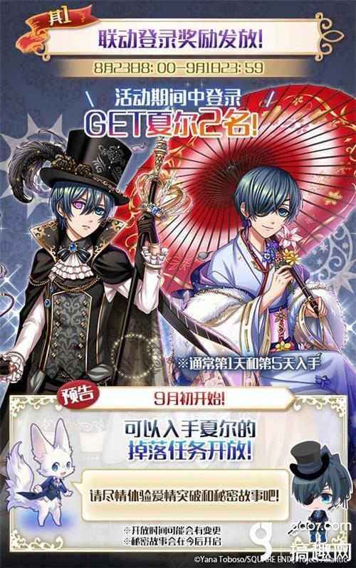 8月23日~9月1日期间,登陆游戏可领取丰厚奖励~!连续登陆还可直接领取夏尔(CV:坂本真绫)王子~!还是两名哦~!到底是选华丽的日觉还是特别的月觉,再也不用犯愁啦~