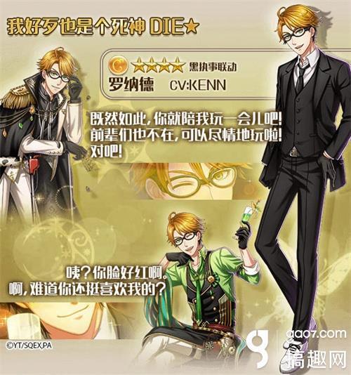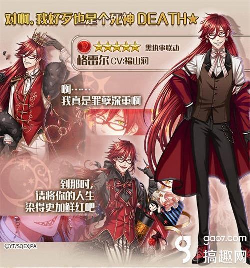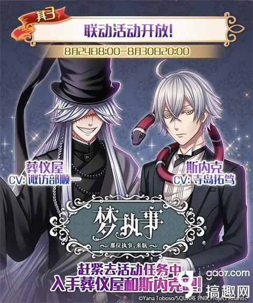 大家期待已久的《梦100》联动《黑执事》活动正式开启啦~6位超人气角色——夏尔、塞巴斯蒂安、格雷尔、罗纳德、葬仪屋、斯内克都将进入在游戏内登场,拉开豪华客船下新篇章的帷幕!全新的语音,全新的故事,那位执事,将会……?!