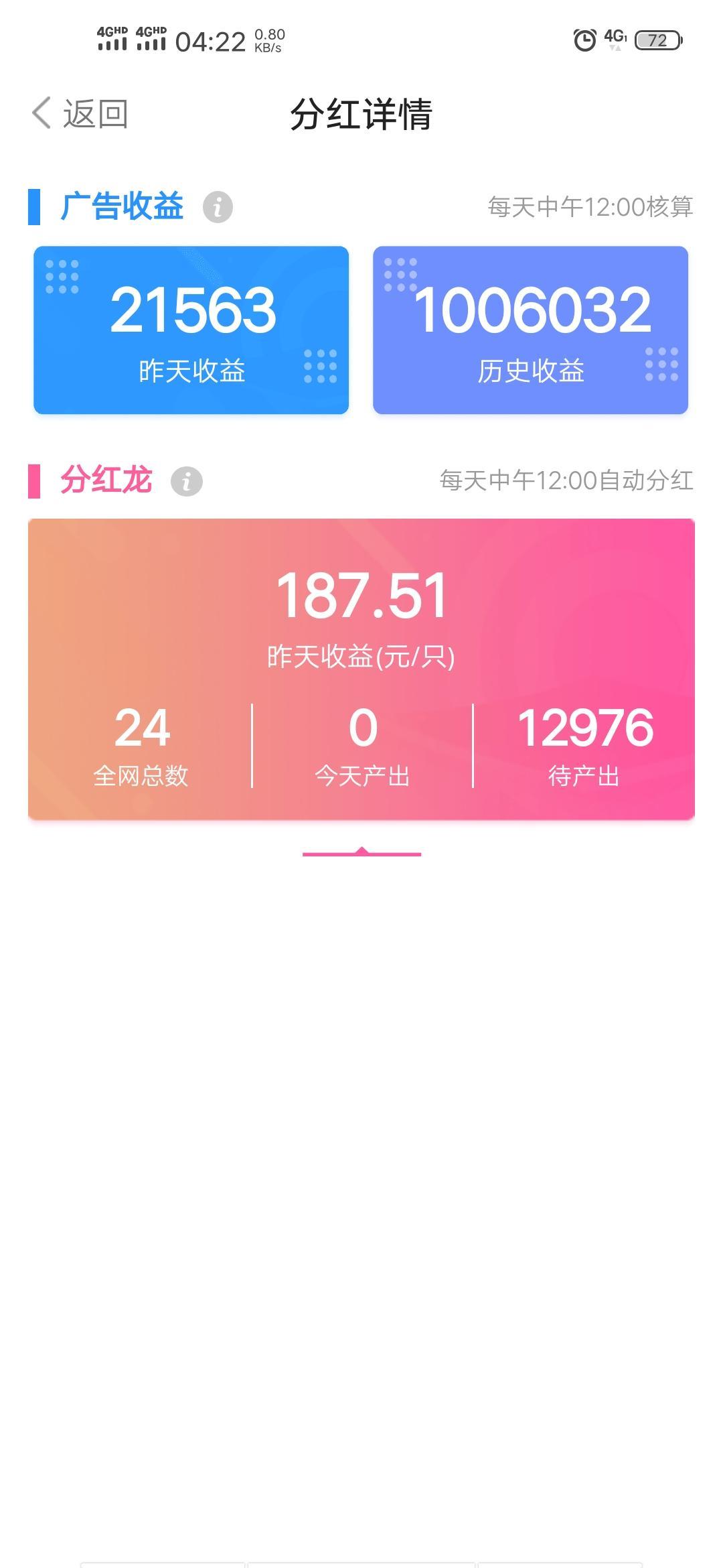 陀螺世界新手刚开始玩的时候肯定赚的钱并不多,但是可以努力升级38升级就能够获得分红龙,大概到38级需要玩10天左右。(PS:每天不会浪费很多时间,想起来上去合下恐龙就好)。合38级龙会随机出来红包龙、算力龙、粉红龙、情侣龙、禄寿财龙、喜龙,可以获得相应的加红包、算力、平台的分红。陀螺世界如果我们不去推广,玩到38级大概需要10天左右,升到38级后小编后台看了数据每只红包龙每天分红120元,目前全网只有9只,还有5000多只正在待产中~只要产出分红龙每天中午12点自动开始分红。
