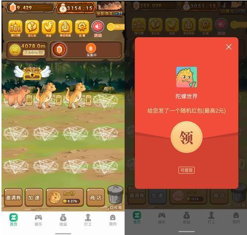 注册登录陀螺世界之后系统会随机送一些恐龙蛋和随机的现金红包,一般登录之后都能顺利提现0.3元,提现都是秒到的,让你注册就能拿到现金奖励。
