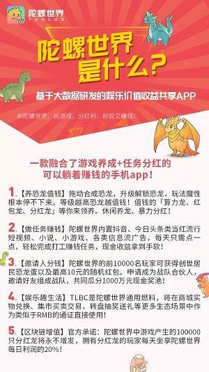 陀螺世界之所以火爆的原因在于可以一步步合成最高级的分红龙和红包龙,每一条都能产生现金价值,如果合成了分红龙,每天都是上百元的现金收益,微信提现是秒到账的,不需要投资只需要推广就可以了。