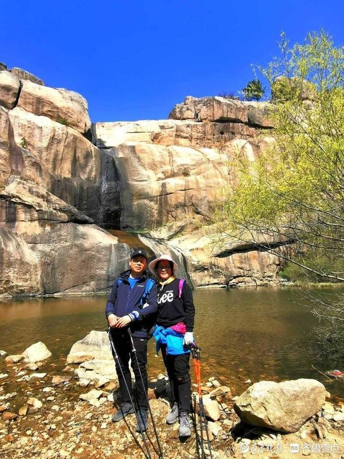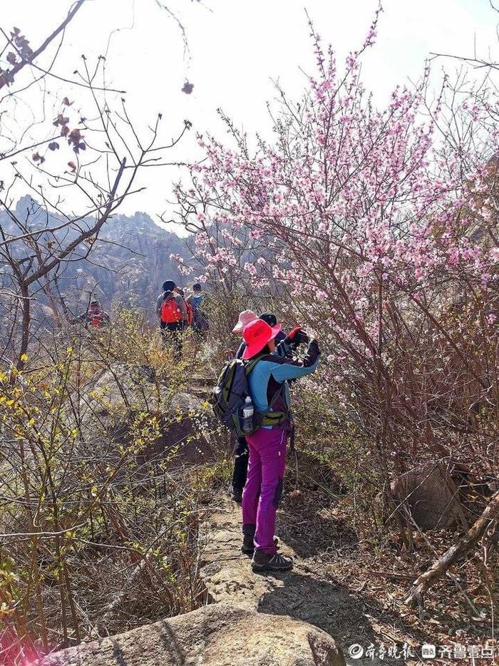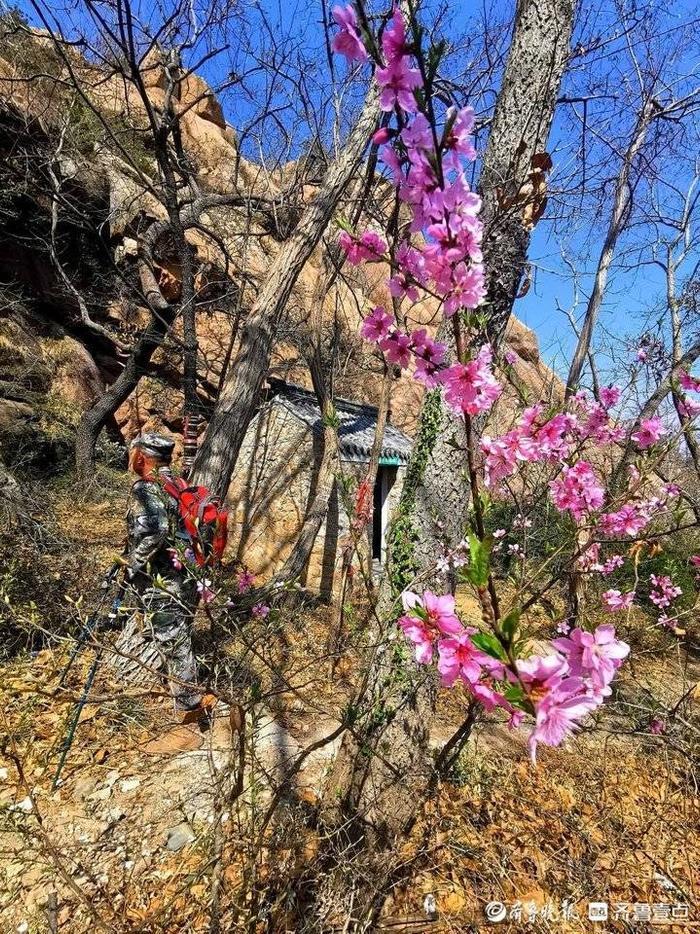 我们在此拍照后,沿着台阶向南边山峰一路上行,穿过一个十几米的山洞,到达一处突前的岩石,这个位置看刚才瀑布是最佳位置,山谷和瀑布就如盆景一样精致漂亮。返回山洞继续向东南方向上行,一路风景不断,这里山石突兀,花草满坡,桃花、杏花、山车梨花、连翘花开满山径,山花中几处古庙宇,更显幽静神秘。