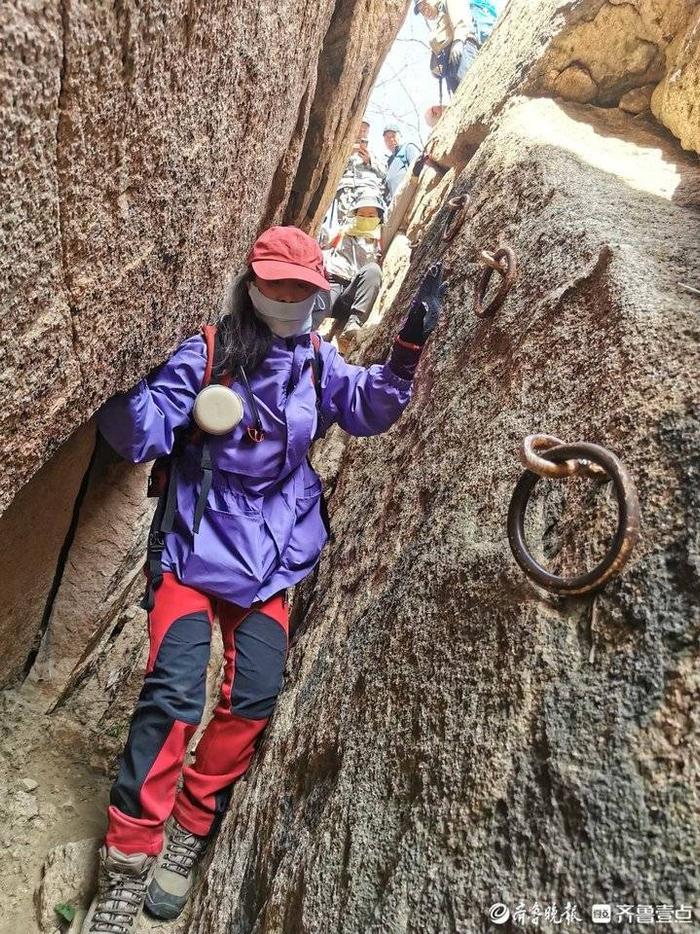 大家在山坡林间又走了一个多小时,终于到达一线天,一线天深而窄仅能容一人通过,略胖的人就很艰难了,好在峭壁上镶有铁环,把着铁环蹬着人工凿的脚窝就可以轻松下去,大家鱼贯而下,各种神态让人忍俊不禁。