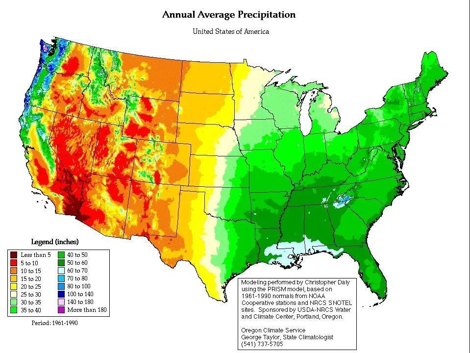 美国大陆年均降水量。西部很干燥。降水量最高在夏威夷,大陆最高在华盛顿州