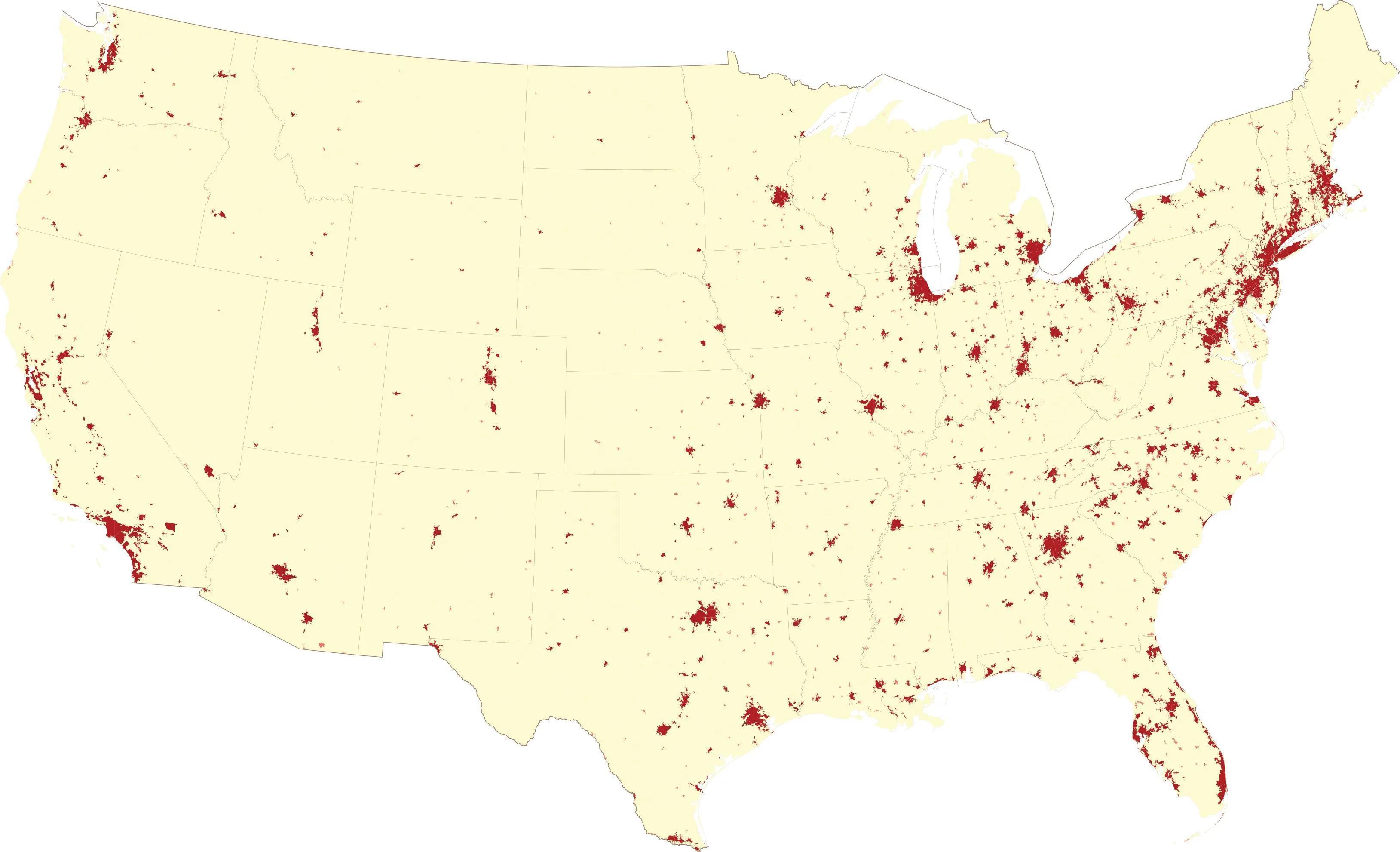美国大陆2015年城建区。东北沿海地区的几个城市已经连接起来组成大都市带