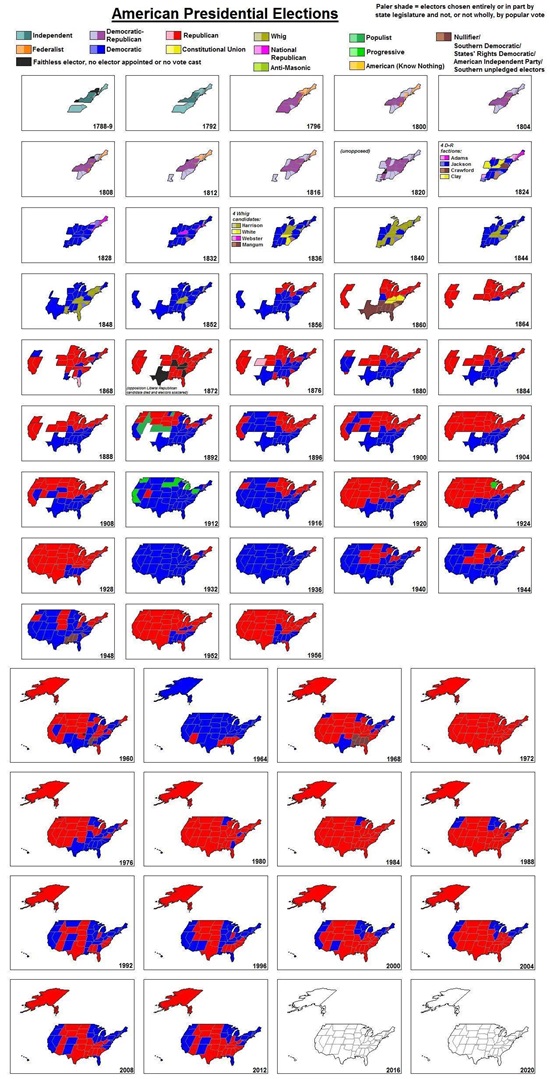 美国每次大选举每个州党支持示意图。可以观察到,如今的民主党/共和党是1856年才形成的。1856年之前党的分布不太一样