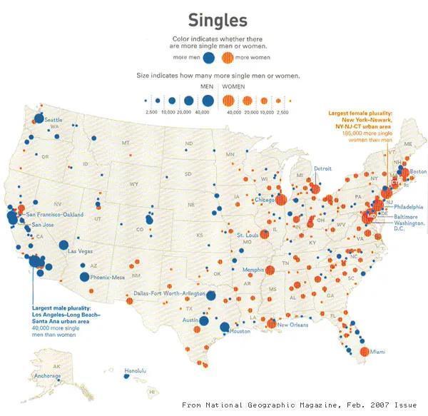 美国男女单身图。蓝色是单身男性,橘色是单身女性。