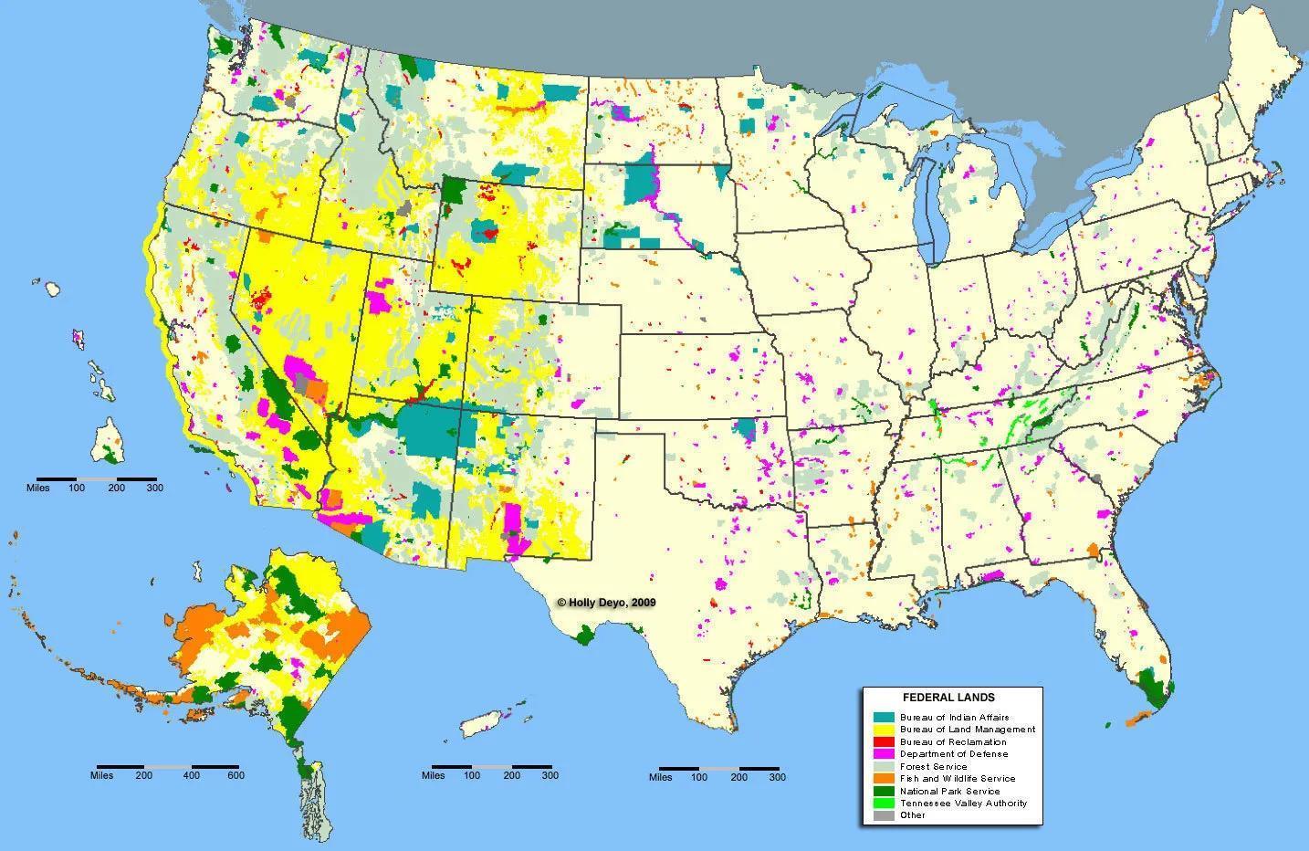 美国国土地图。很多中国人可能没想到,“万恶资本主义”的美国,其实40%的土地是公共土地,大部分位于大西部。