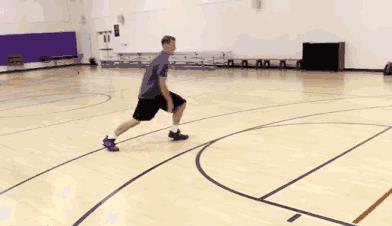 右手运球,左脚蓄力起跳,反之亦然,在跳步前,蓄力脚提前蓄力,为跳步做好充足的准备
