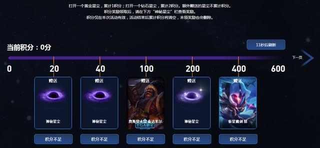 20积分就可以获赠一个神秘星辰的皮肤奖励,100积分则赠送泰达米尔的奥斯曼大帝,400积分就可以领取到只有峡谷之巅才有的奖励皮肤了—斩星魔剑。