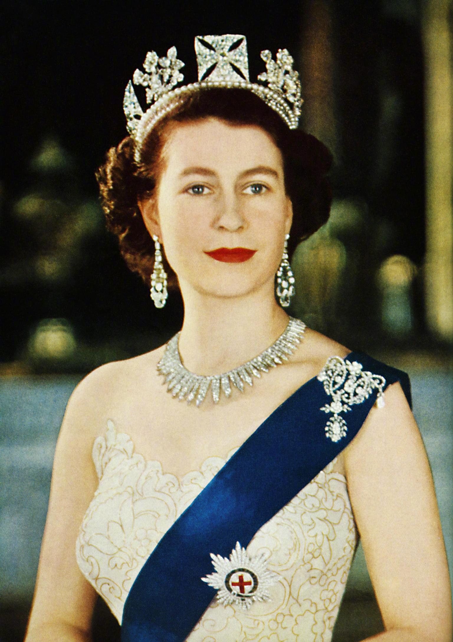 伊丽莎白二世头戴冠冕端庄优雅,雍容华贵。