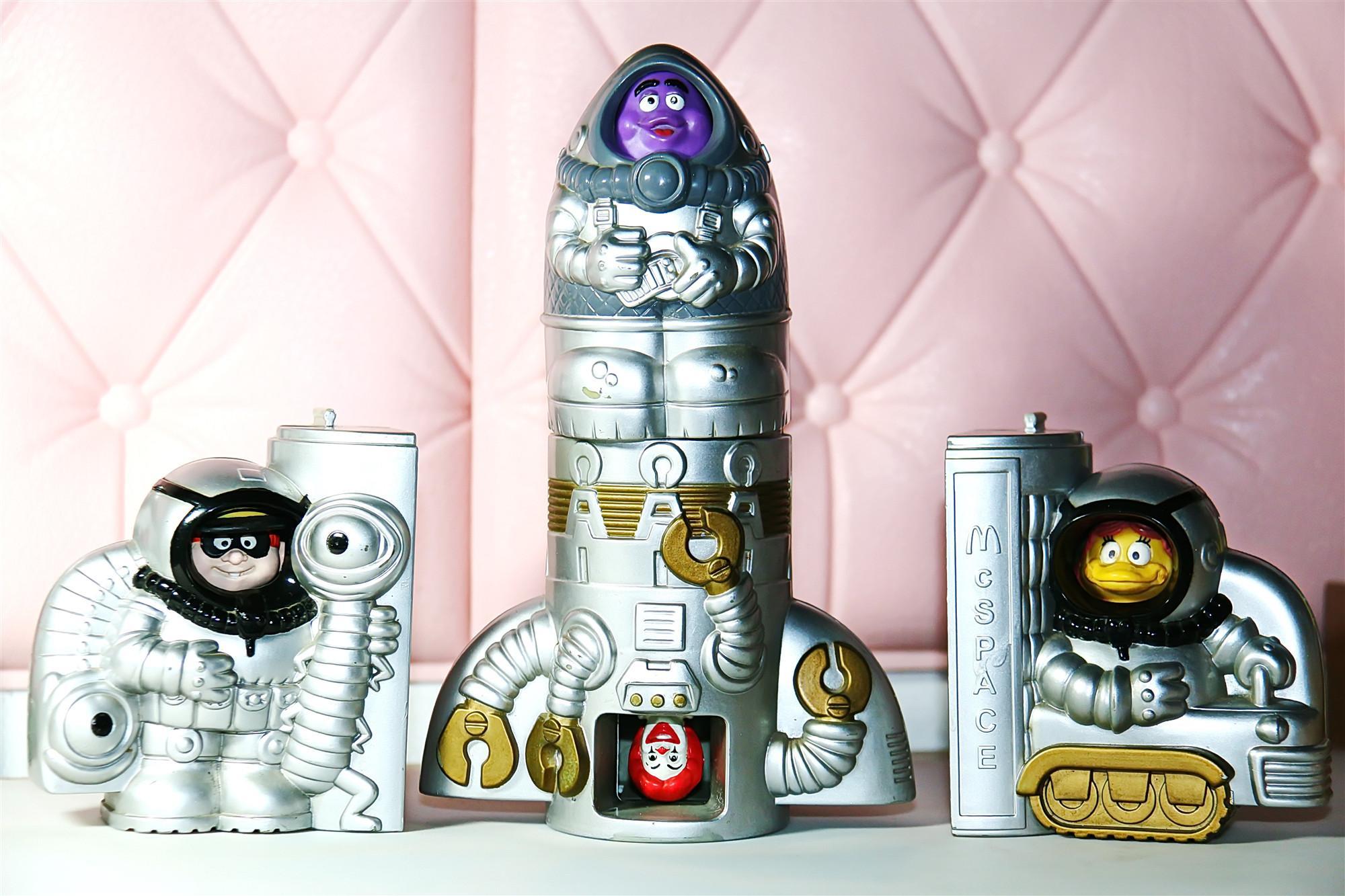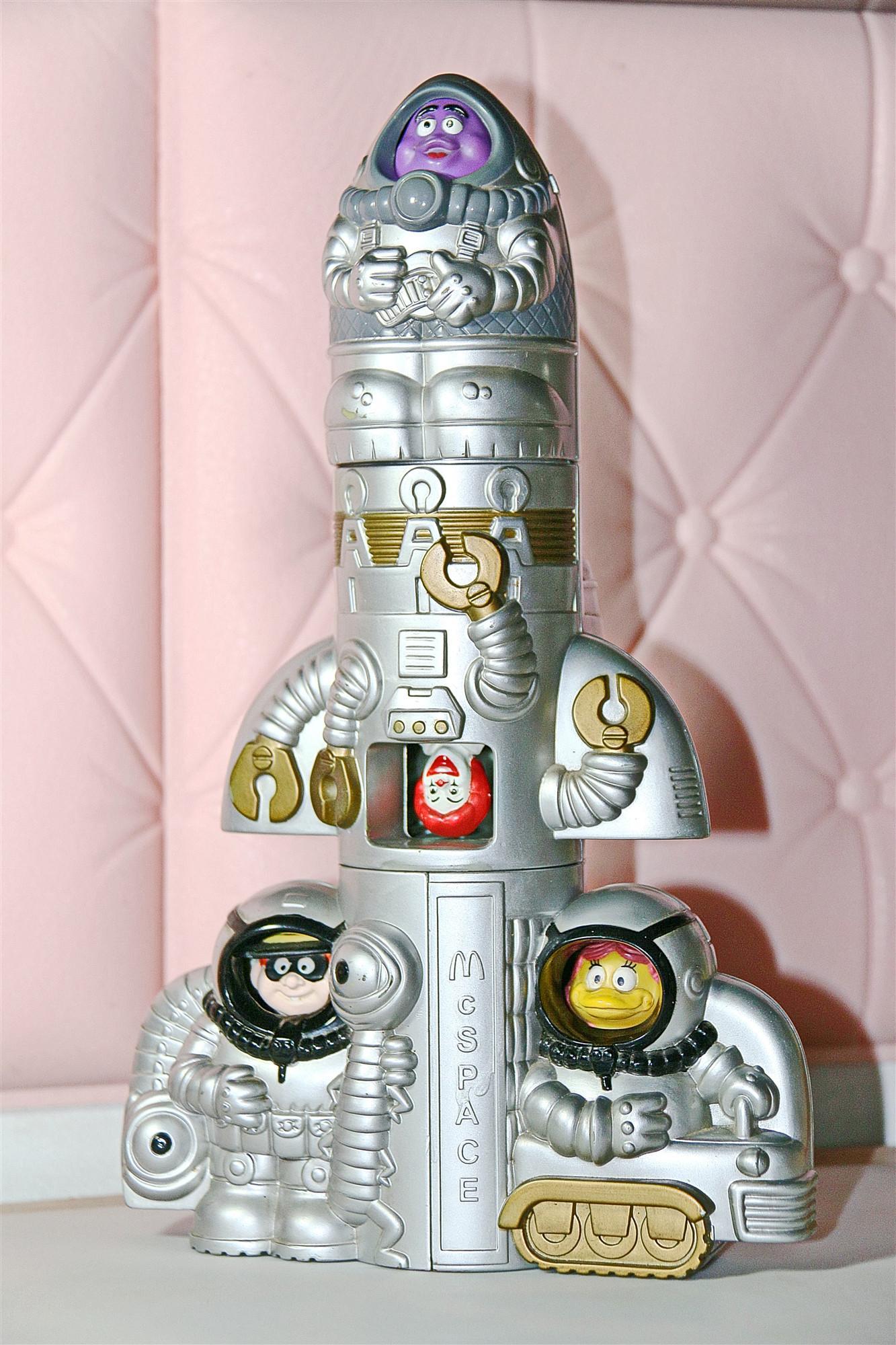 这是一套麦当劳在1997年发行的一套玩具,它是由麦当劳当时的四个宣传人物(奶昔大哥,汉堡神偷,大鸟姐姐小飞飞,麦当劳叔叔)组成的一套火箭玩具。