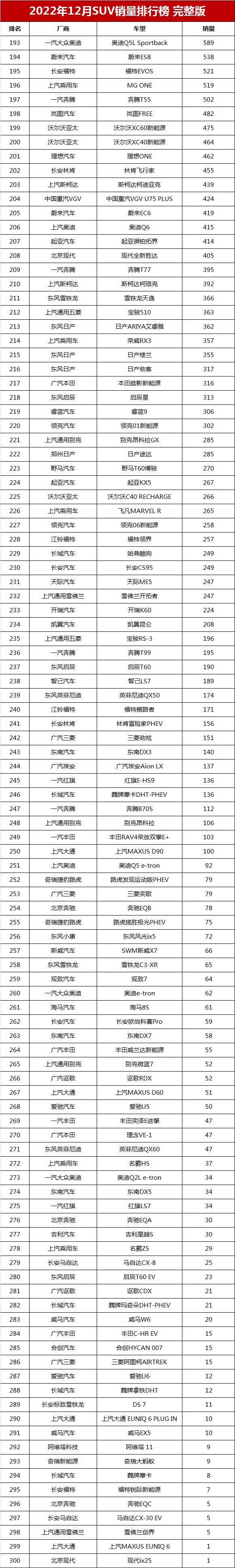【2022年12月SUV销量排行榜完整版】12月份国内SUV市场整体表现出色,销量同比和环比双双上涨。据乘联会官方日前公布的乘用车销量数据显示,2022年12月国内SUV市场零售销量达到101.8万辆,与2021年同期相比,增长6.0%;与11月份相比,环比增长31.5%。下面,我们一起去看看301款SUV车型在12月份的零售销量及其排名情况: