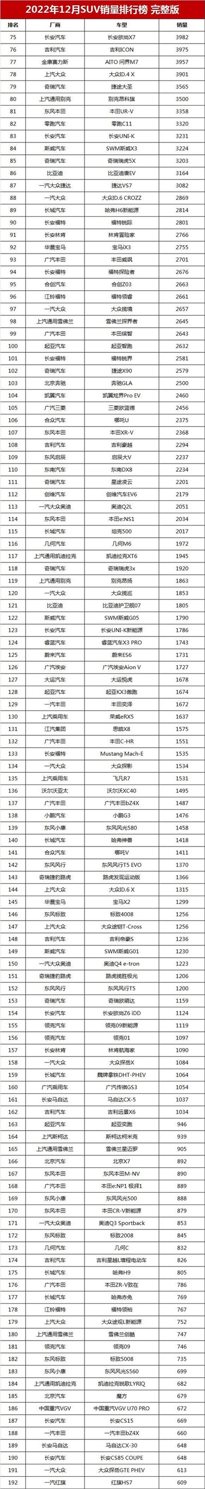 12月SUV销量排行总榜单,长安CS75排第2,哈弗H6第21,奇骏第66名