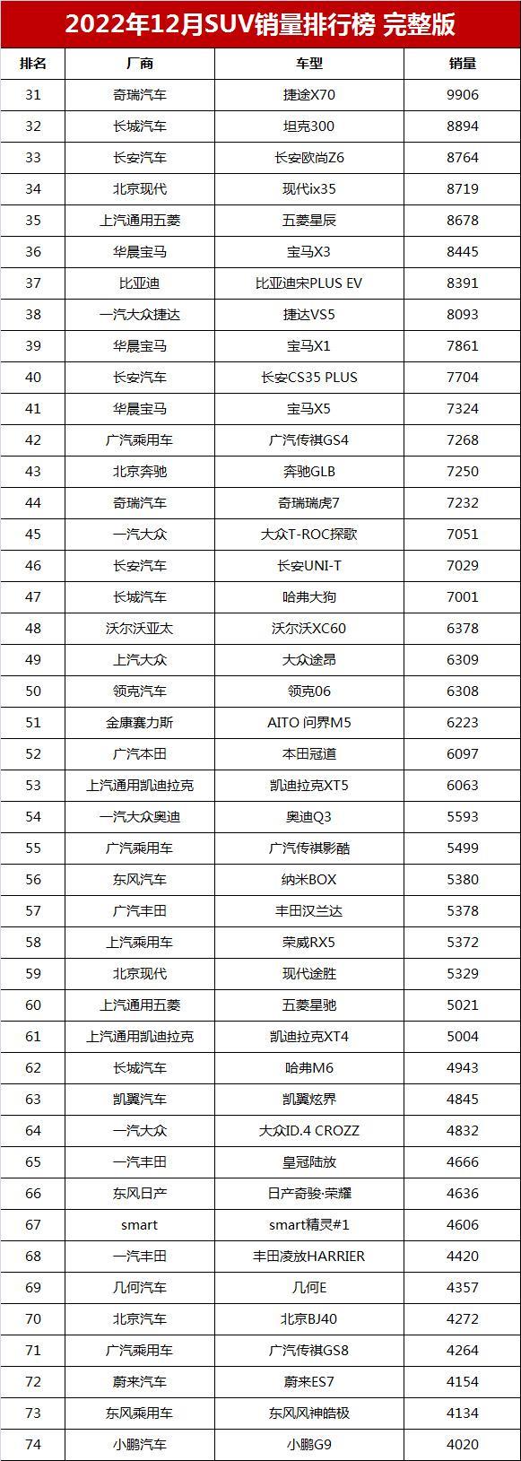 作为高端硬派SUV的坦克300表现不俗,12月销量达到8894辆,排名第三十二位。2022年新推出市场的长安欧尚Z6,12月也获得了8764辆的销售业绩。