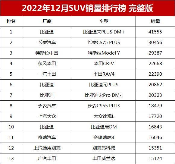 数据显示,2022年12月销量过万辆的SUV车型共有30款,其中7款车型销量超过2万辆。比亚迪宋PLUS DM-i零售销量41555辆,蝉联月度SUV销量冠军。