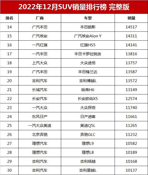 本田皓影、埃安AION Y、红旗HS5等三款车型销量都达到14000+的水平,排名第十四至第十六位。而卡罗拉锐放、大众途岳、丰田锋兰达、吉利博越L、哈弗H6等几款车型的销量则超过1.3万辆,排名第十七至第二十一位。值得一提的是,作为多年国内SUV销量冠军的“神车”哈弗H6,12月销量只有13249辆,仅排名第二十一位。