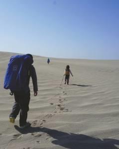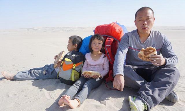 11月2日,徒步沙漠无人区之旅启程。刚见到沙,3个小孩异常兴奋,建基地、堆城堡,玩得不亦乐乎。然而,从第三天起,新鲜感被眼前千篇一律的景色抹得一干二净,再加上每天十多公里的徒步带来的疲惫感,林林率先闹起了情绪。见哥哥不走了,雯雯、柏如也哭了起来。