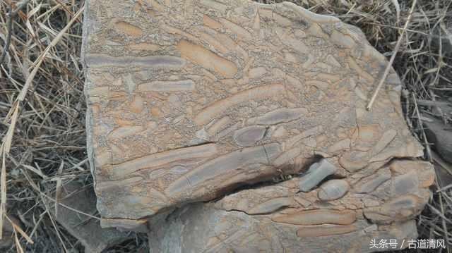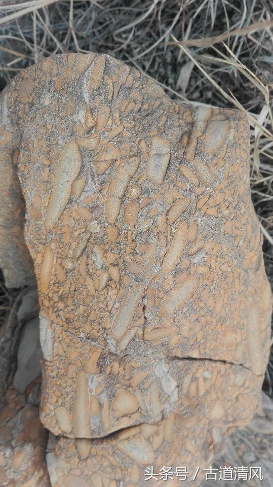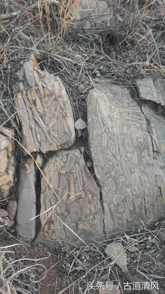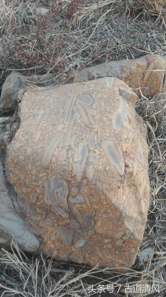 这是野外发现的没被打磨的鱼籽石的样子,鱼籽石也称竹叶石,因石上有类似鱼籽或竹叶状的红、绿、赭等颜色而得名。