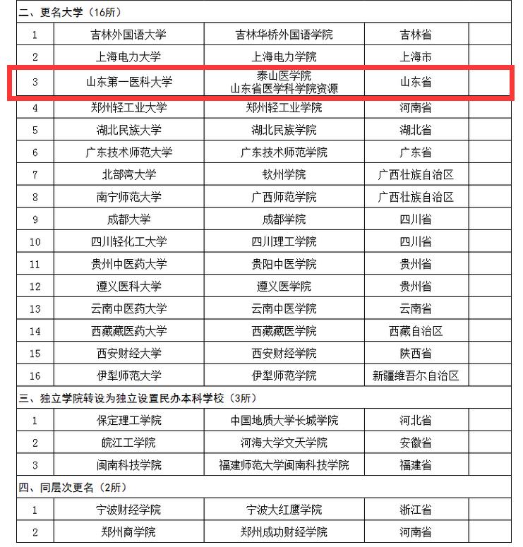 还有一所是更名大学,即备受关注的泰山医学院、山东省医学科学院整合而成“山东第一医科大学”。