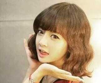 这女生平齐式的刘海,齐的金栗色的短发型的泡面卷发型,有点小外翘的发尾,女生看起来有点小俏皮。