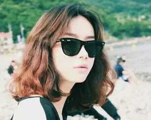 时尚的大额头发女生,中分式的齐肩式的泡面卷发型造型,再加上酷酷的眼镜,让女生多了几分时尚和神秘感。