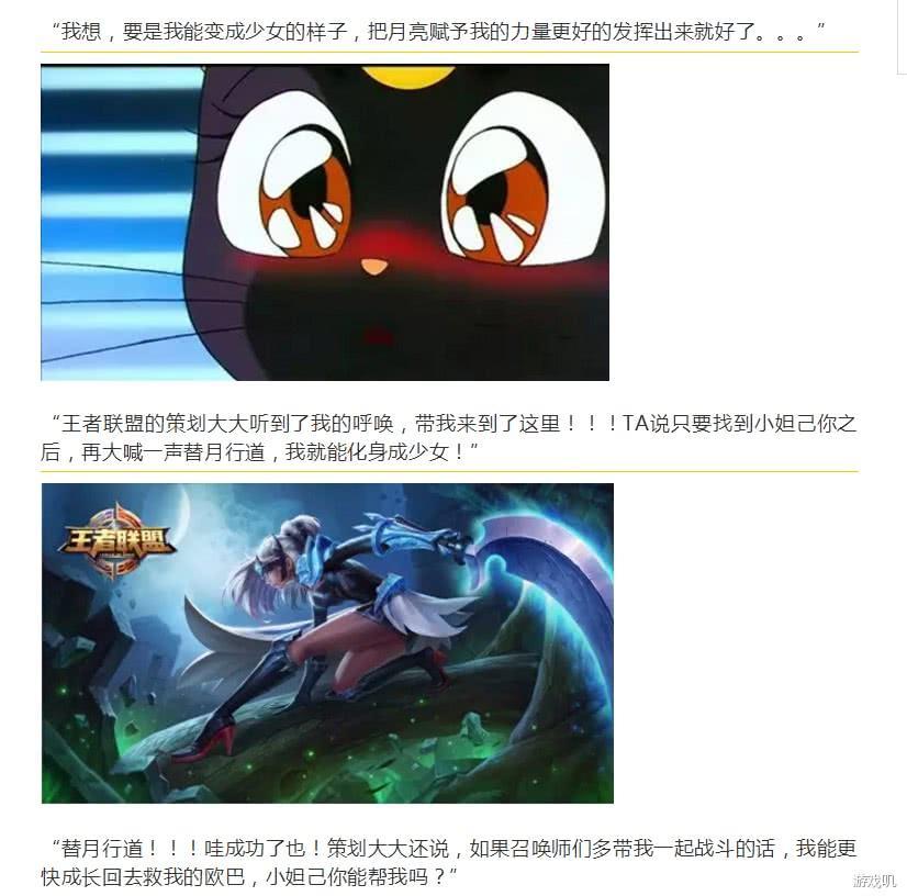 而且王者荣耀官方也曾字啊推送当中提到,露娜的由来就是露娜猫,在王者荣耀中变身“替月行道”的少女。只是不知道这样有没有触及版权问题,估计也的确不太适合所以后来都没提过露娜猫。