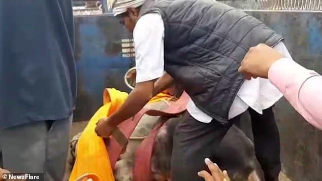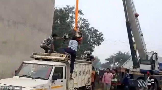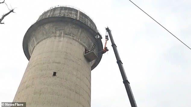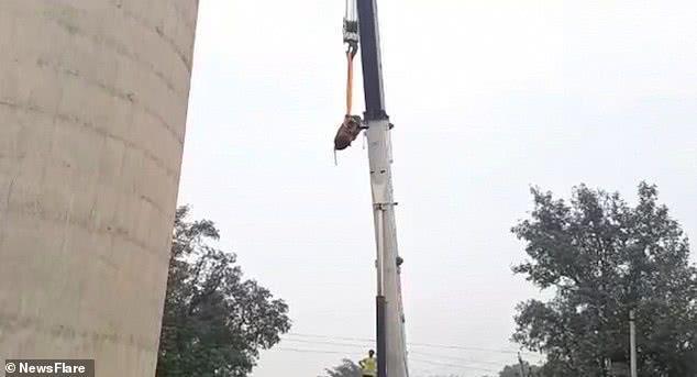 印度一头牛爬上61米水塔被困,救援者花4小时将它救出,牛真倔强