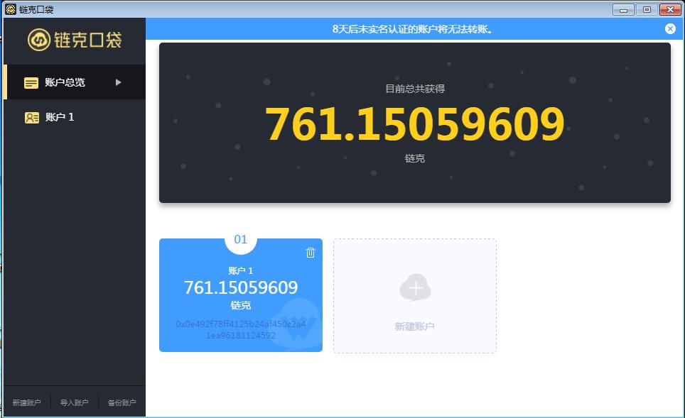 打开PC端“链克口袋”应用,最为醒目的顶栏那排提示:“8天后未实名认证的帐户将无法转帐”,也就是意味着今年底尚未实名认证的帐户原玩客币就废了!点击公告消息后会出现一温馨提示,要求用户扫码下载链克口袋APP并在手机上完成帐户的实名认证。刚才顾歌也是第一时间完成了实名认证,在这里也将顺便提醒尚未完成链克口袋实名认证的兄弟姐妹们,得赶紧实名认证了!总之至今为止我是从未接收过提醒实名认证的短信通知。