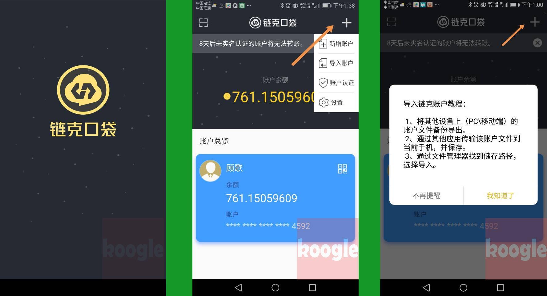 链克口袋的实名认证也很简单,在认证过程中,爱观察的顾歌留意到其认证过程是采用芝麻信用数据完成的(跟芝麻信用分无关),认证步骤这里也分享一下:扫描二维码下载并安装好链克口袋,找开APP后点击右上角的“+”符号,顾歌建议先实名认证后再导入帐户(如下图顺序)。