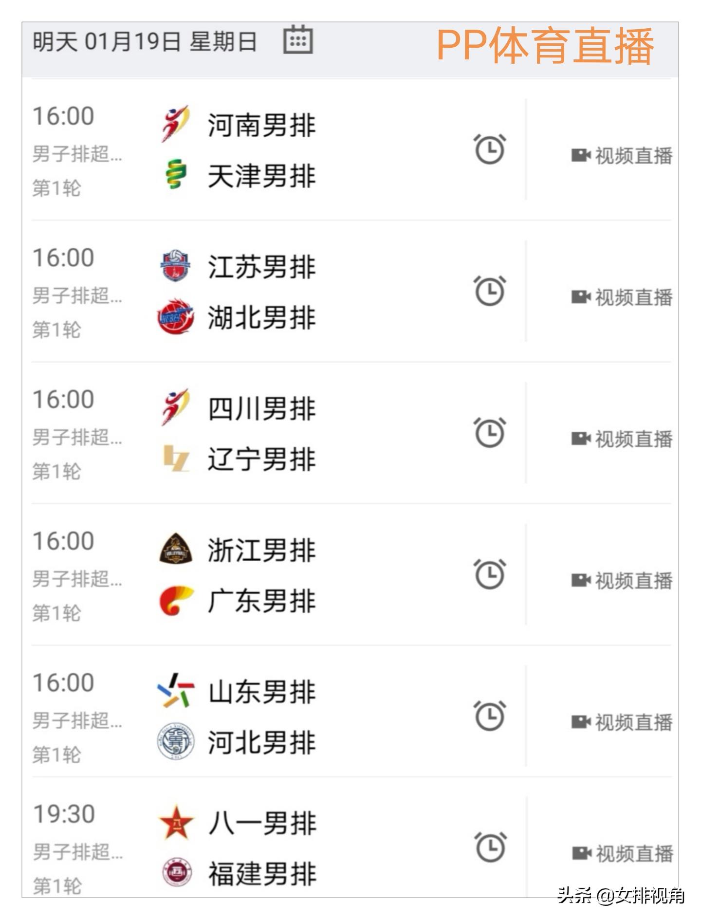 1月19日16:00,中国男排超级联赛正式开赛,首轮上海与北京轮空,6场比赛2个时段进行(如图),PP体育将直播全部比赛;