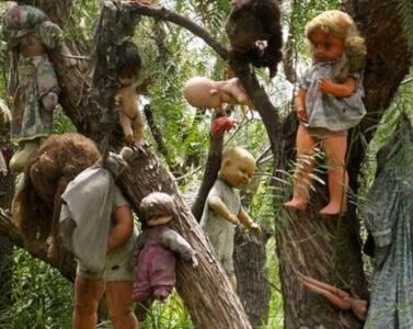 在墨西哥首都墨西哥城南部与霍奇米尔科之间的Teshuilo湖上,有一个极为诡异小岛,这个小岛被称为娃娃岛(也有称为玩偶岛)。在墨西哥城可租上一个平板船,乘船两小时就能到达这个小岛,整个行程大约会花上美金100~120美金。为啥说这个小岛极为诡异呢?是因为娃娃岛上挂满了一千多个各式各样的恐怖娃娃,遍布于全岛。这些娃娃有些还很完整,有些残缺不全,还有一部分只剩下“尸块”了。这些娃娃被绳子绑着,空荡荡地悬挂在树上,看着就很恐怖。